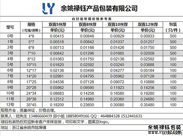余姚祿鈺包裝常規(guī)自封袋價格表。對于很多需要用到自封袋的客戶來說,對于自己的產(chǎn)品需要用到多大的自封袋,自封袋價格是多少總是一件頭痛的事。